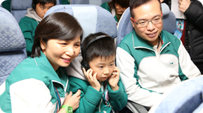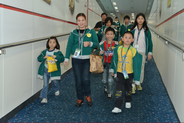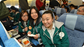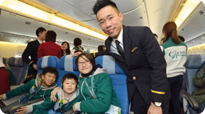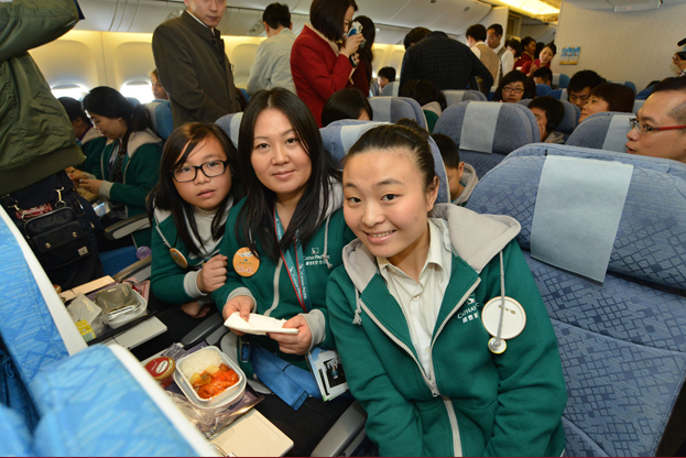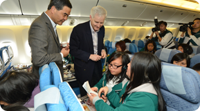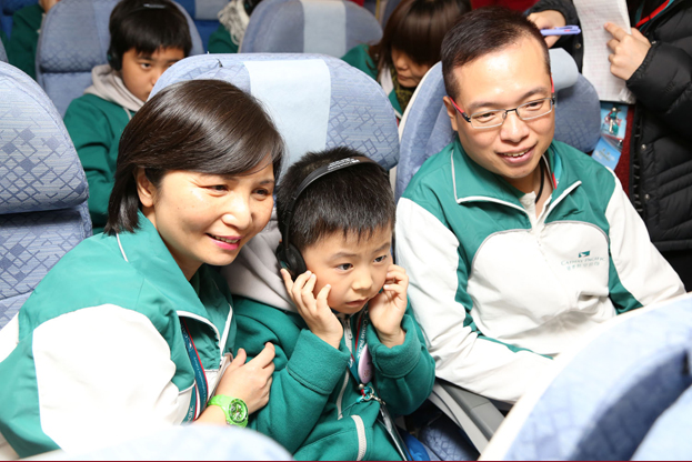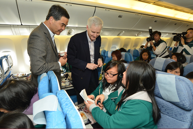 活動的主禮嘉賓香港特別行政區行政長官梁振英先生和史樂山先生在機艙內與參加的家庭輕鬆地交談。