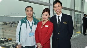 (右起)Nelson, Vince和另一位義工,任職企業網站編輯的黃楚東很高興能為一班特別的乘客實現飛行夢想。