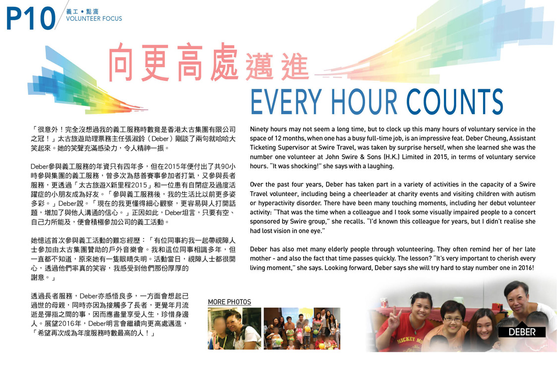 Deber 對各種義工活動都感興趣,認為無論服務對象是長者、小朋友、還是殘疾人士,都值得關心,從中自己亦對生活有更多深刻體會。
